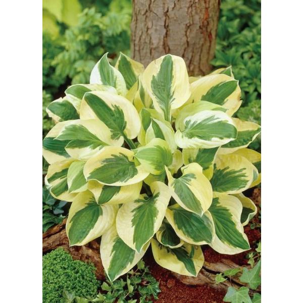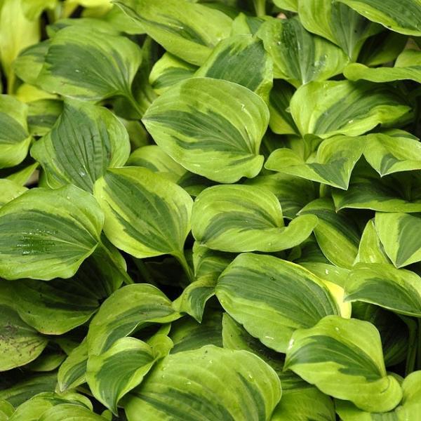ソースイートは、光沢のある緑色の葉の縁に、クリーム色の斑が入るホスタです。